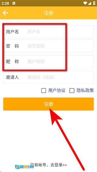 4、在注册页面,输入用户名,设置密码等信息,点击注册,完成账号注册。
