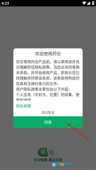 1、进入药信后,在隐私政策弹窗中点击同意按钮,可进入登录页面。