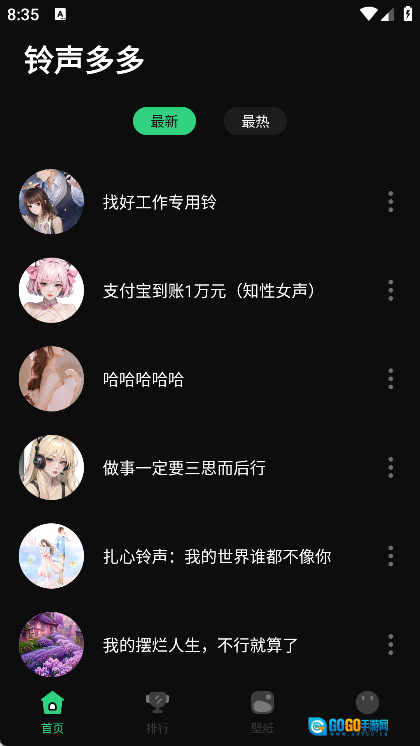 首页设有最新铃声与最热铃声板块,用户可自由选用这些铃声。