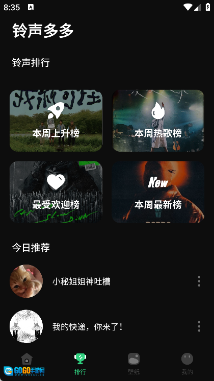 2、通过排行榜,你能知晓本周上升榜、本周热歌榜、最受欢迎榜和本周最新榜的情况,另外还有今日推荐铃声。