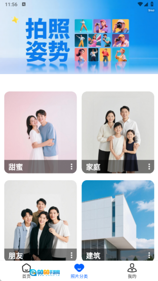 4、照片分类页面包含甜蜜、家庭、朋友、建筑和风景这些分类。