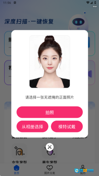 3、点击女生发型选项,接着可以选择拍照上传或者从相册里挑选图片,之后就能选择喜欢的发型来进行试用啦。