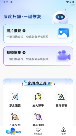 首页将提供照片恢复、视频恢复功能,同时还包含复古滤镜、放大镜、亮度调节工具,以及女生发型、男生发型相关功能。
