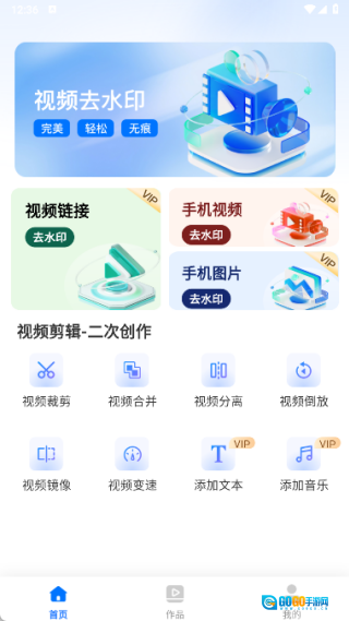 首页包含视频链接去水印、手机视频处理、手机图片处理功能,以及视频裁剪、合并、分离、倒放等操作选项。