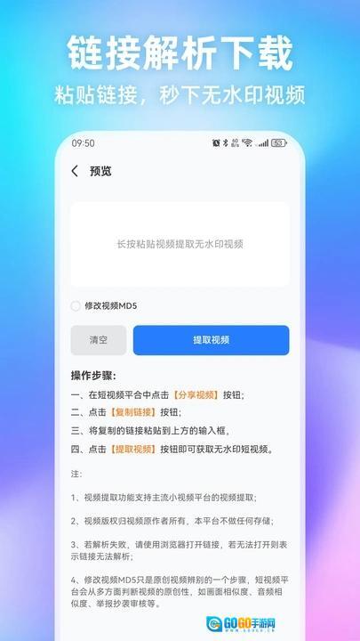 2、进入视频链接去水印页面后,复制你的视频链接地址,接着点击“提取视频”按钮,就能快速完成视频提取操作。