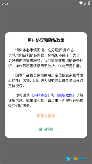 阅读并同意用户协议与隐私政策后,点击“接受”按钮即可开启使用。