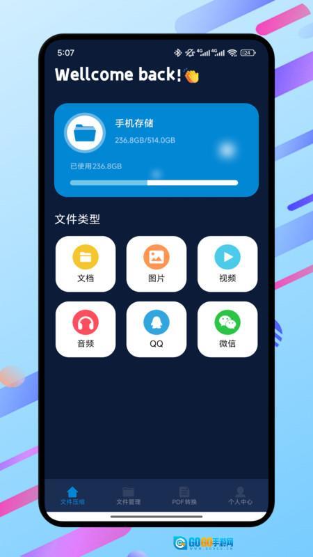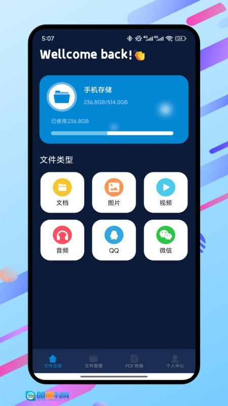 1、在文件压缩页面能够对各类文件类型进行管理,涵盖的类别主要有文档、图片、视频、音频、QQ相关文件以及微信相关文件等;