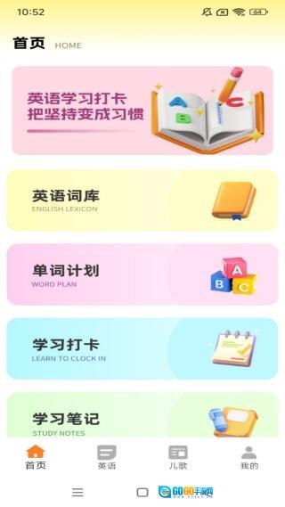 进入首页后,系统会推送丰富的学习资料,同时提供英语词库、单词计划、学习打卡、学习笔记等实用功能。