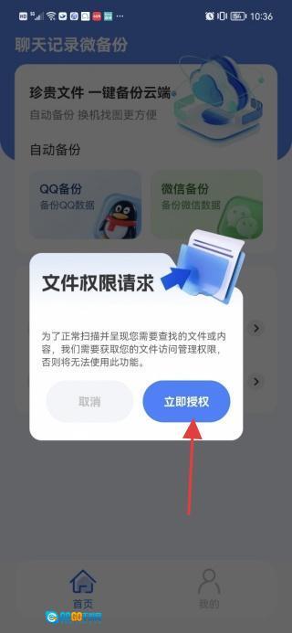 2、点击QQ备份选项,此步骤需获取你的文件访问权限授权,请点击“立即授权”按钮;