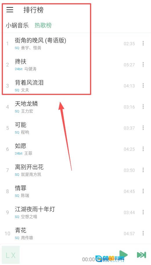 2、想知道大家都在听什么吗,那就去看看“排行榜”中的热歌榜,榜单清晰地列出了排名和歌曲信息。