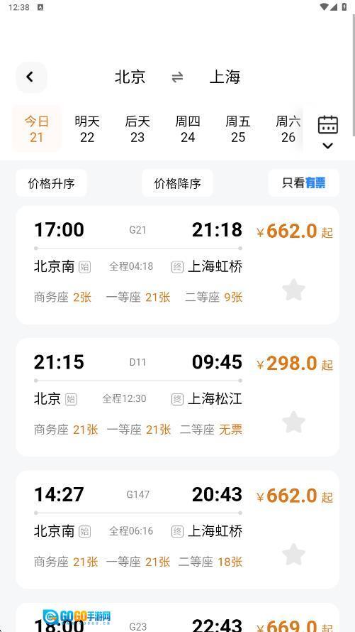 2、所有车次信息都十分详尽,一键即可确认,还能查看票价。
