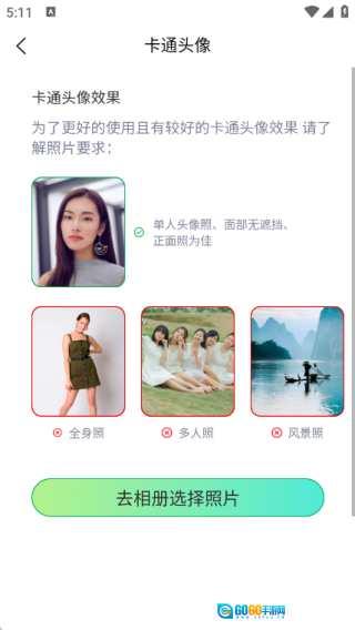 3、进入到卡通头像中,然后点击去相册选择照片,再选择好照片一键制作即可;