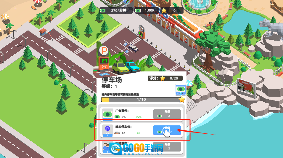 3、选择增加停车位需消耗2个绿币,可额外容纳12辆车停放,从而吸引更多游客前来。