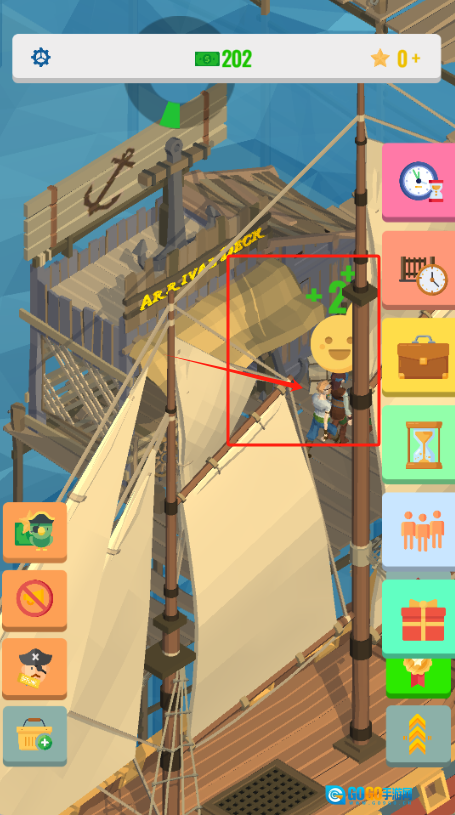 3、点击红框标注的位置可衔接+2海盗,右上角显示有202金币。