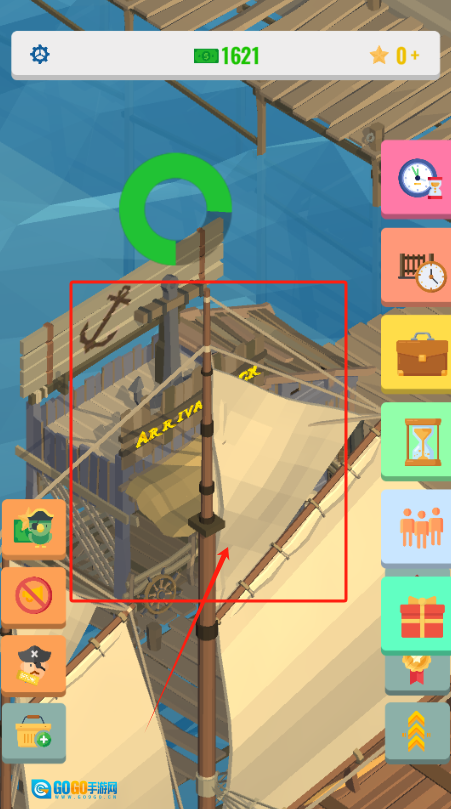 1、点击红框内的按钮让海盗登船,注意右上角显示的金币数量为1621,星星数量是0。