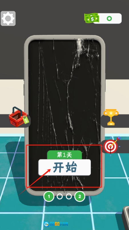 1、点击屏幕中央的开始按钮即可进入第一关,左上角的齿轮图标是设置功能入口,右上角显示的5美元为奖励内容。
