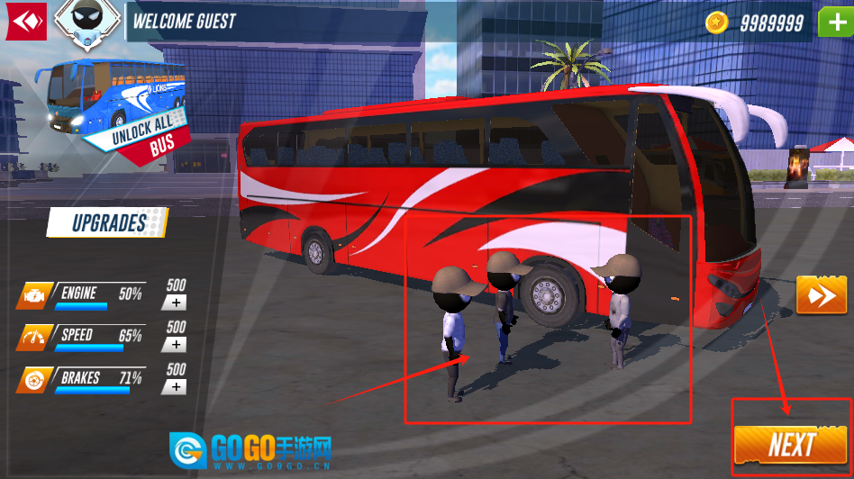 1、点击右下角的NEXT按钮即可开始游戏,左侧区域能够对引擎和刹车的性能进行升级。
