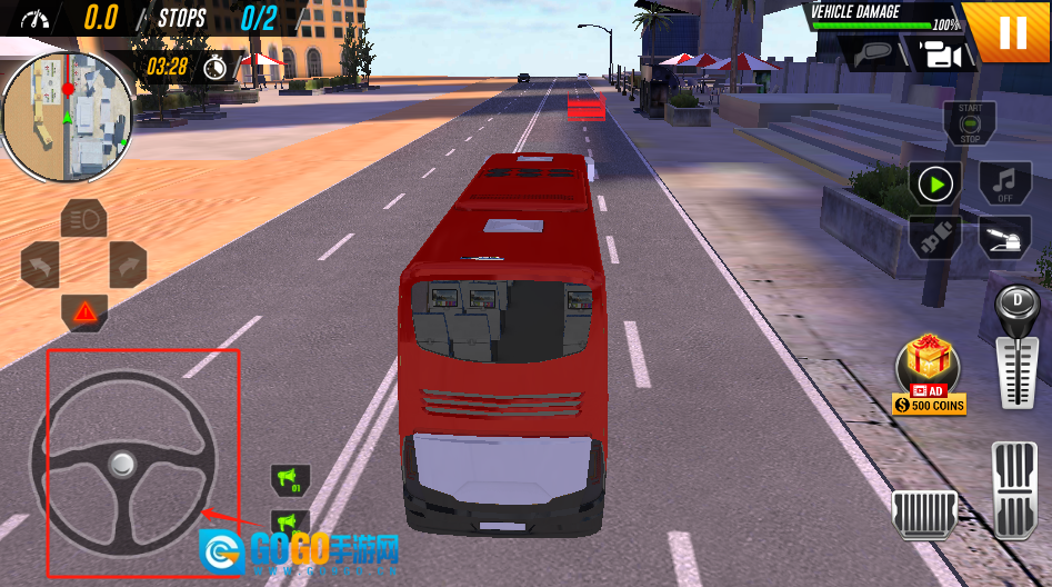 2、红色大巴行驶在路上,通过左下角的方向盘操控方向,需留意上方的站点进度以及车辆状态。