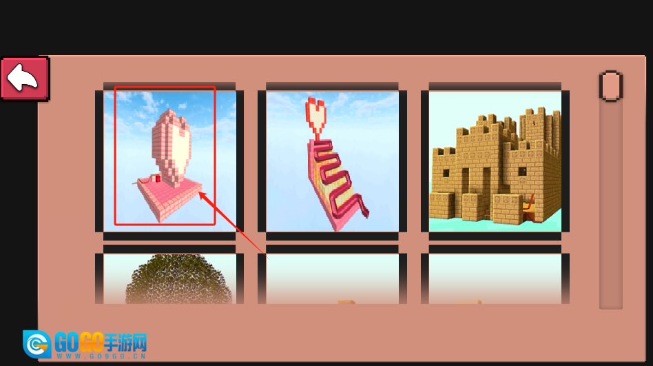 3、左右滑动选择城堡模型,点击红色箭头确认建造,蓝天背景十分漂亮。
