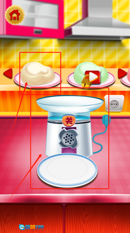 2、厨房内粉色台面上放置着和面机,需用白色盘子承接面团,同时要确保旁边的插座已插好电。