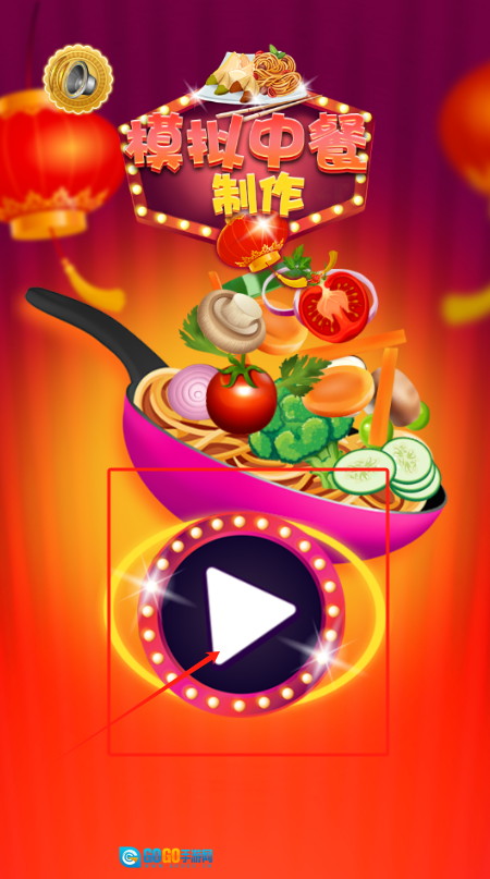 1、点击下方带有光圈效果的播放按钮即可启动游戏,背景中红灯笼上显示着“模拟中餐制作”几个字。