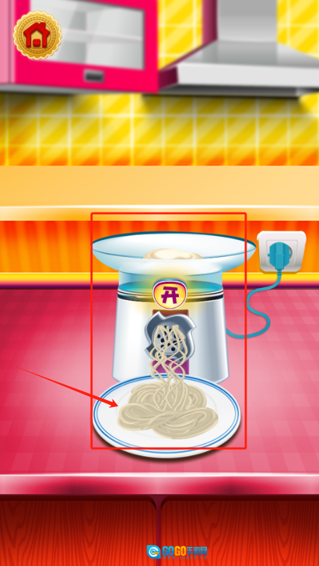 3、操作面条机把面条挤到盘子里,留意厨房中粉色的台面和黄色的瓷砖墙这一场景。