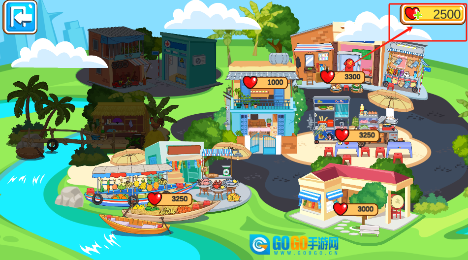 看爱心旁边显示的数字是2500,点击房子图标就能购买,其中价格最高的需要3300爱心。