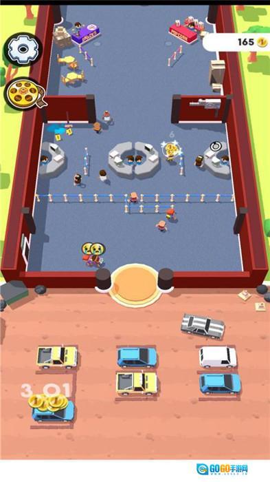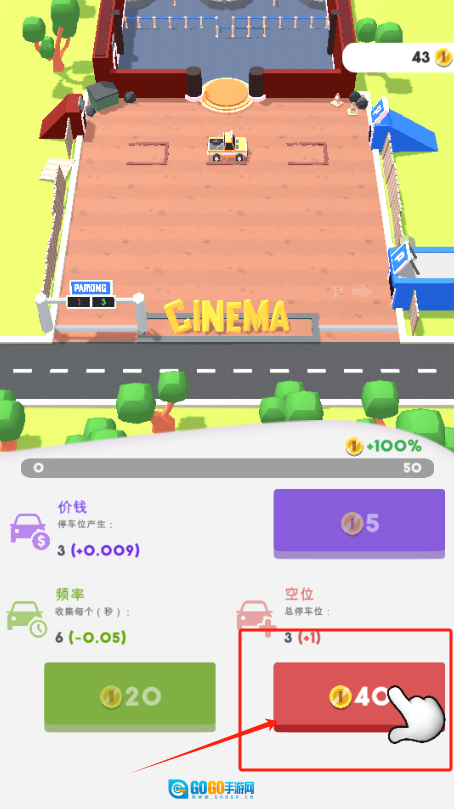 1、点击红框内的汽车,使其停靠到标有PARKING字样的车位上,同时留意上方影院排队的人群数量。