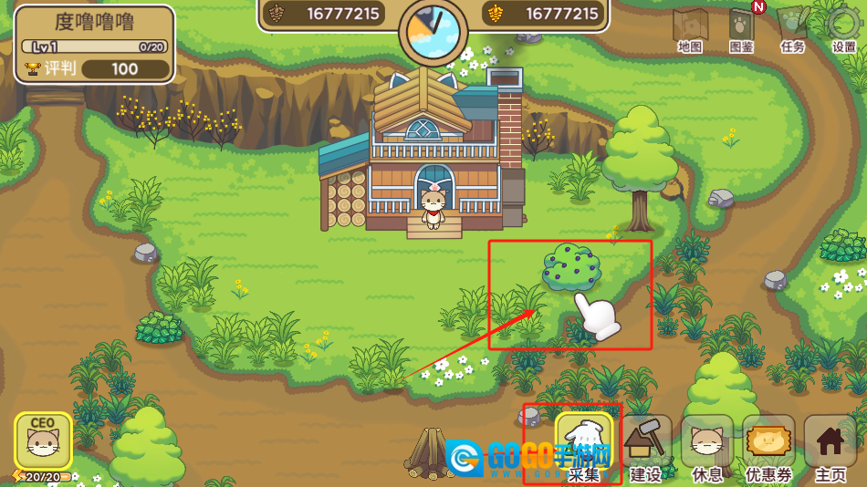 3、点击采集按钮来收集红框内的植物,界面上方会显示资源的数量以及任务的进度。