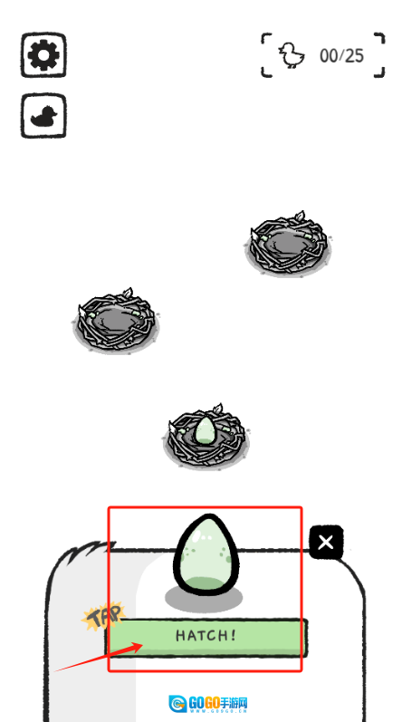 2、点击HATCH按钮进行孵蛋操作,下方鸟巢内的蛋目前处于孵化状态。