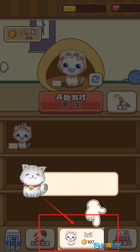 1、点击“开始游戏”按钮,消耗金币购买猫粮投喂架子上的小猫,以此获取更多金币。
