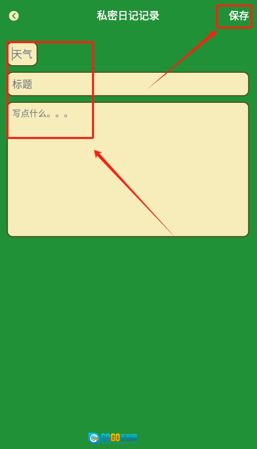 3、填写当日天气、日记标题并写下内容,确认无误后,点击右上角的“保存”按钮即可完成。