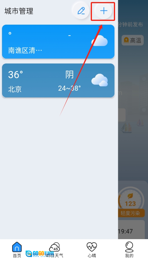2、在弹出的菜单中,点击右上方的加号按钮,即可准备输入你想要关注的地点。