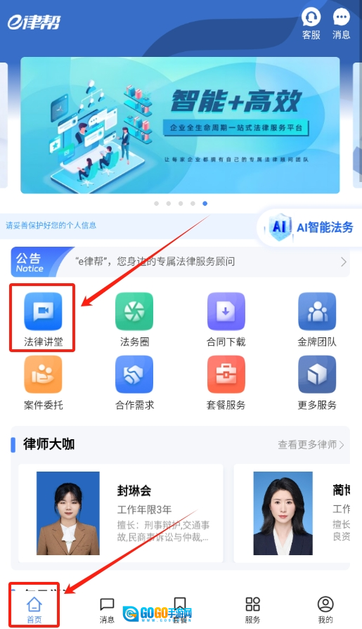 1、启动e律帮软件,在首页找到“法律讲堂”按钮并点击进入。