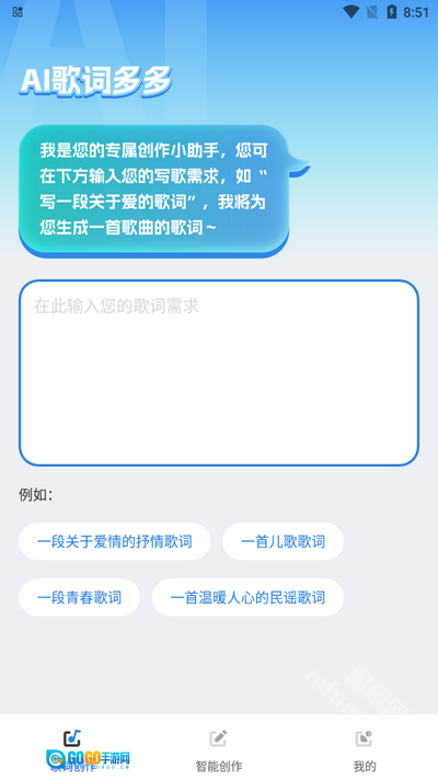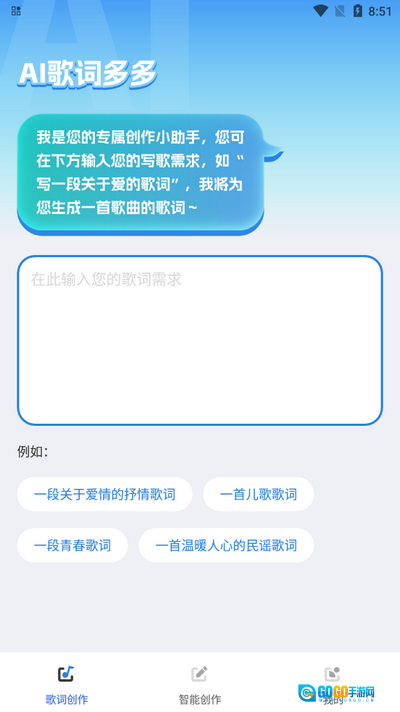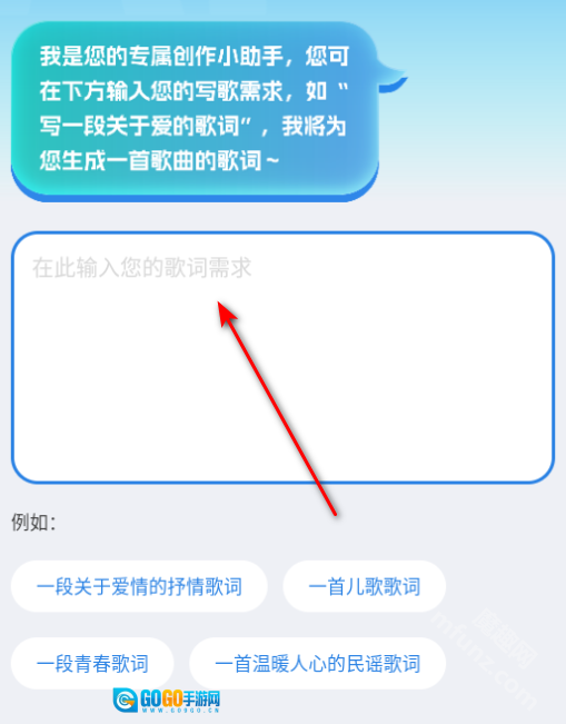1、进入ai歌词多多软件,在这里输入歌词需求