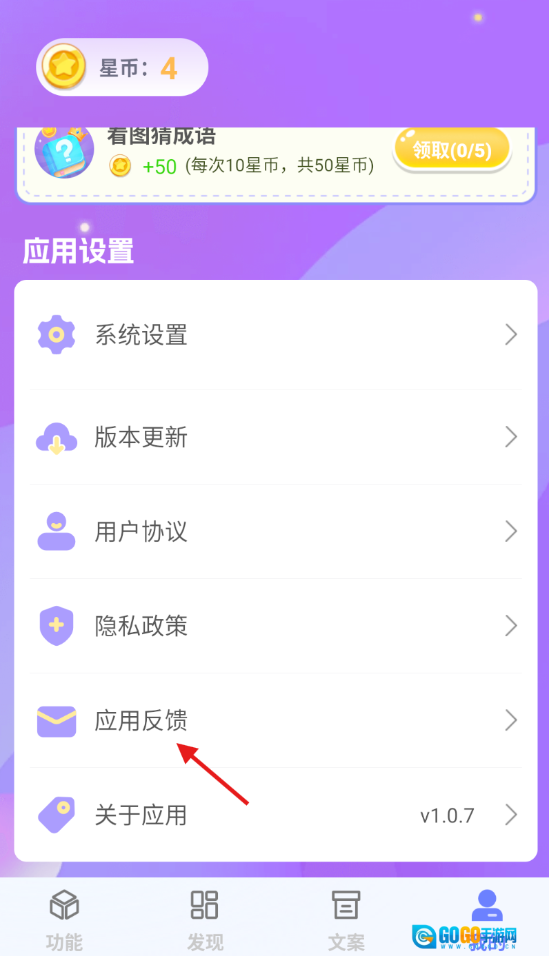 2、进入个人中心页面后,向下滑动屏幕,找到“应用反馈”选项并点击,即可进入反馈界面。