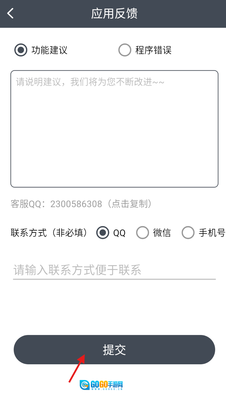 3、进入反馈界面后,选择“功能建议”或“程序错误”这两个类别之一,接着填写反馈的具体内容以及您的联系方式,最后点击“提交”按钮,即可完成反馈流程。