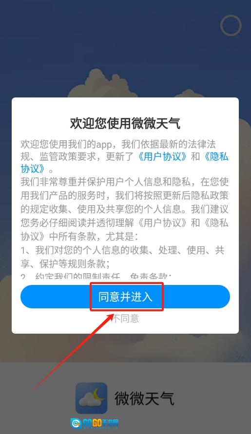 1、启动微微天气应用,点击“同意使用”按钮后进入主界面。