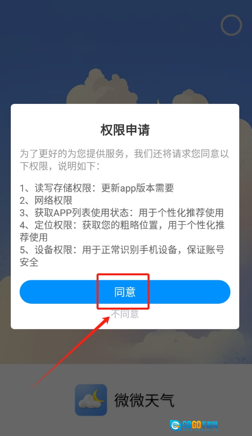 2、随后在权限申请页面,点击同意各项权限以获取天气数据。