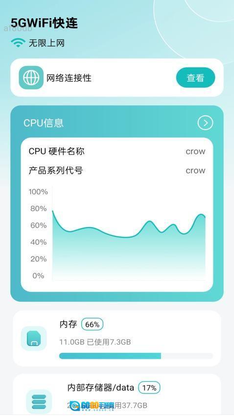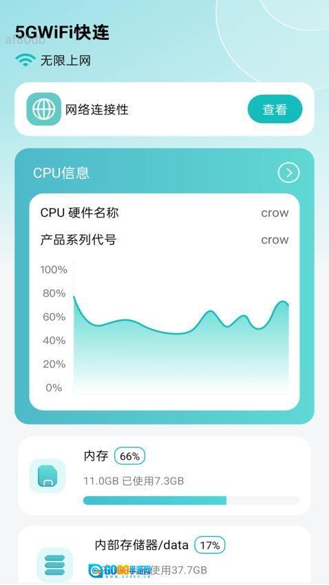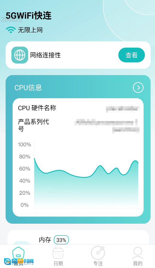 1、启动应用后,首页的“网络检测”功能会实时展示当前WiFi或5G网络的信号强度、延迟情况,以及设备的CPU负载数据。
