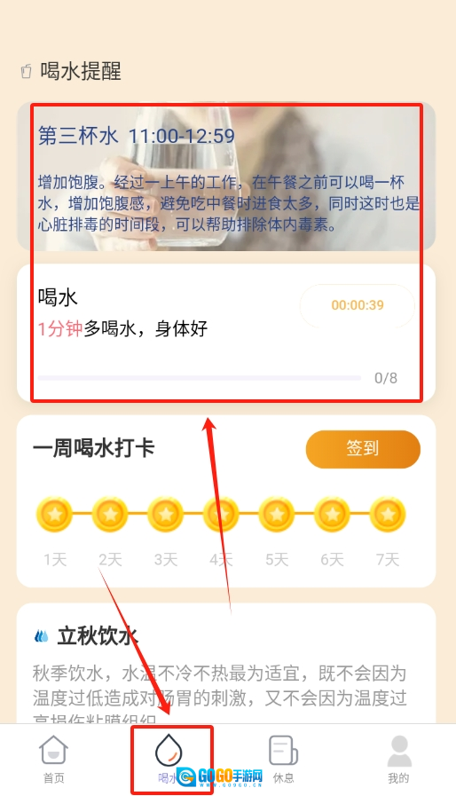 2、切换到喝水页面后,系统会按时提醒饮水,这样就不用担心忘记补充水分了。