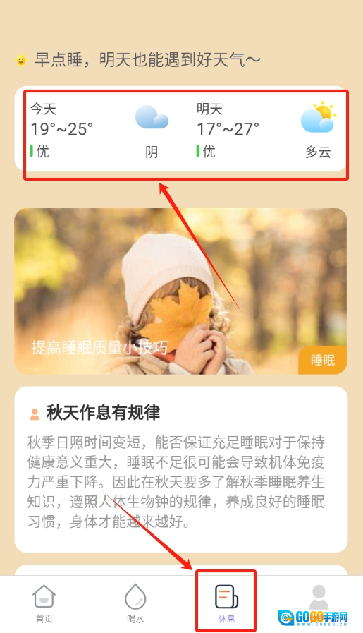 3、打开休息页面,既能查看天气预报,还能看到许多教你规律作息的实用文章。