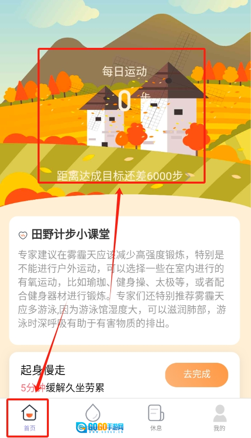 1、打开田野计步软件,进入首页后,当天的步数数据会清晰地呈现在眼前,一目了然。