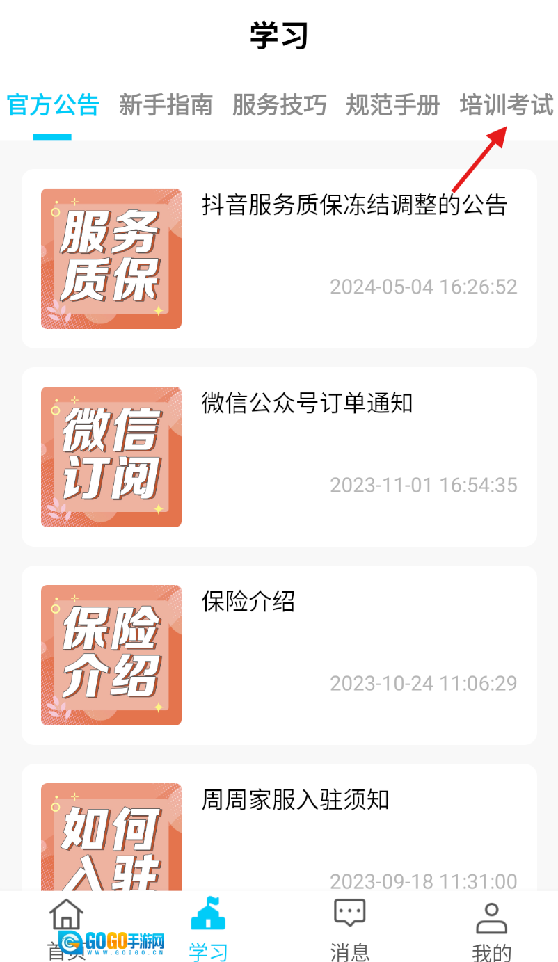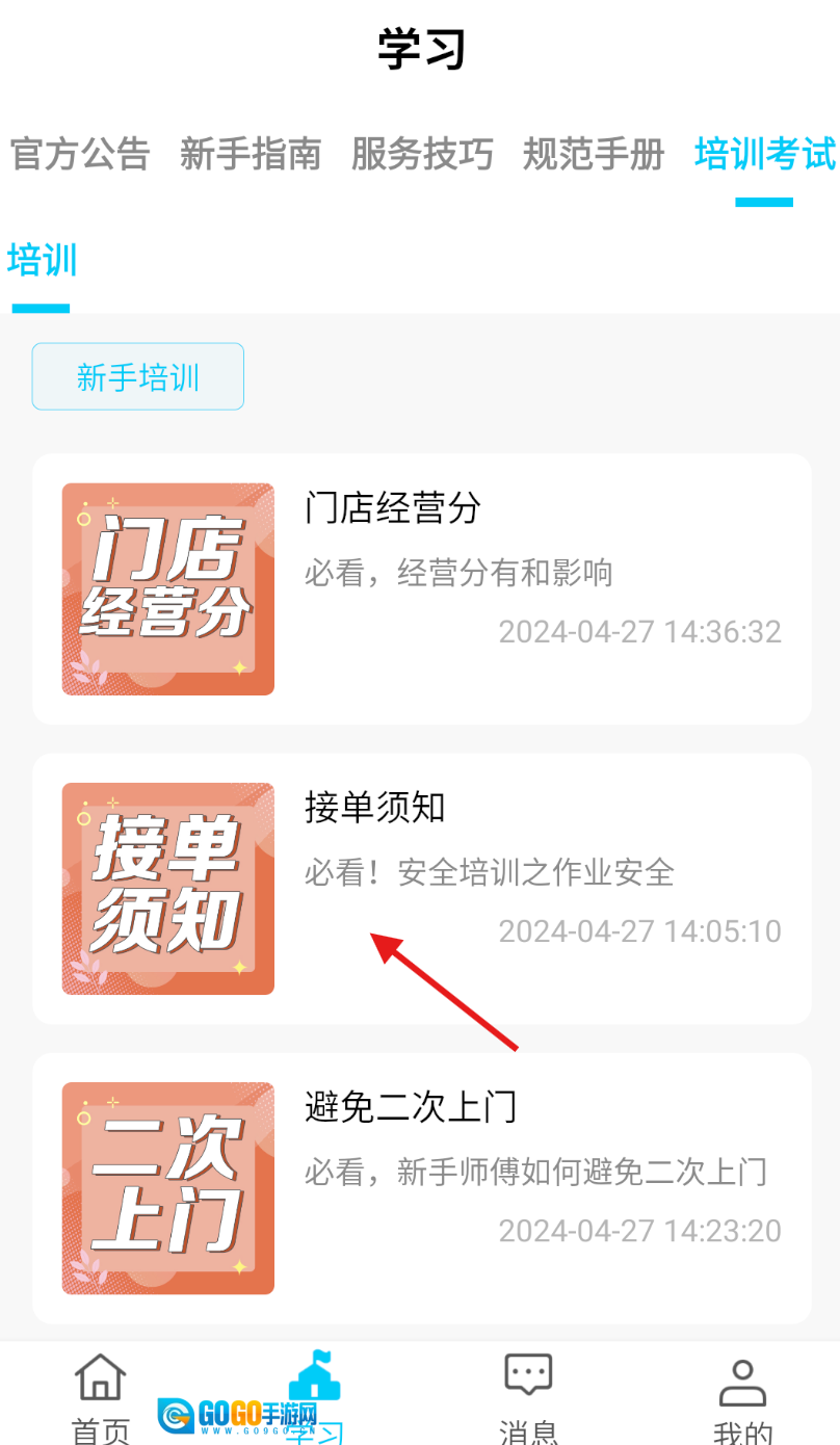 3、在培训考试列表页面,浏览页面上展示的新手培训相关内容,从中随机挑选一项点击,进入其详情页面。