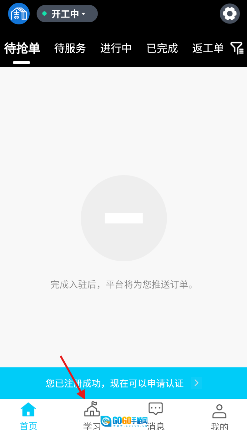 1、启动周周家服应用,在底部导航栏里找到并点击“学习”按钮,进入学习中心界面。