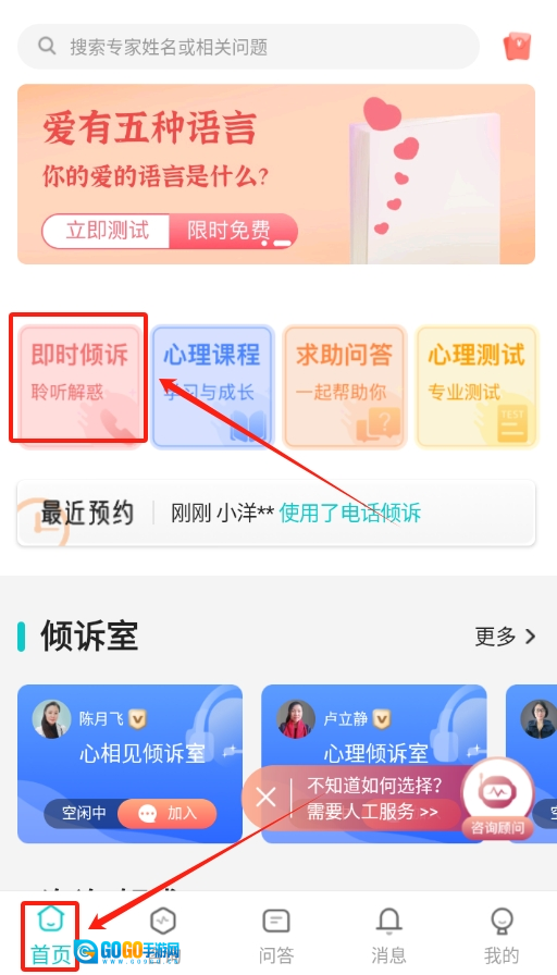 1、启动软件进入主页面后,找到“即时倾诉”按钮,点击该按钮即可开启倾诉之旅。