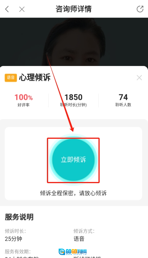 3、要是觉得这位咨询师靠谱,直接点击 “立即倾述”,就能畅快说出心里的事儿。