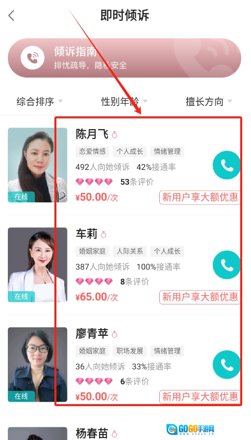 2、在咨询师列表中,认真挑选一位合心意的咨询师,点击进入其详情页面。