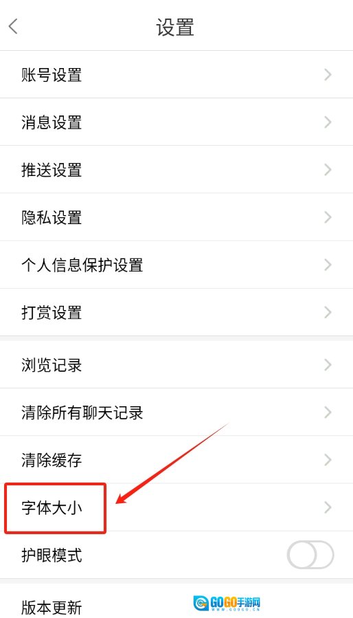 2、进入设置页面后,找到“字体大小”选项,然后点击该选项。