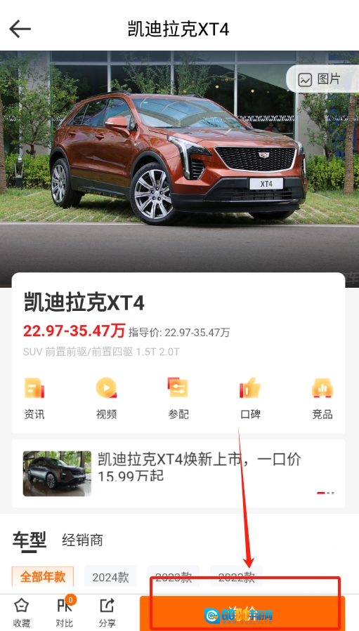 2、确定好具体的汽车型号后,找到页面右下角的“询价”按钮,点击该按钮即可开始咨询价格。